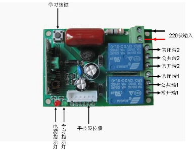 3、配套遥控器:选择好工作方式后松手,再按住学习按键不放,指示灯亮,松开手,按所要配套遥控器A键发射信号,控制器学习指示灯闪下再常亮,再按所要配套遥控器的B键发射信号。控制器学习指示灯熄灭,遥控器配对成功。此时AB键则控制两路继电器通断。多增配遥控器重复以上步骤。